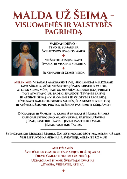 Kviečiame tikinčiuosius, ypatingai šeimas, susitelkti bendroje maldoje, šaukiantis Dievo gailestingumo, kuris „kaip Dievo galia, kaip dieviškoji riba prieš pasaulio blogį“ (Benediktas XVI) padėtų išsaugoti mūsų Tėvynės laisvę ir apginti šeimą – visuomenės ir valstybės pagrindą, apšviestų žmonių protus ir širdis atmesti blogį ir pasirinkti gėrį.